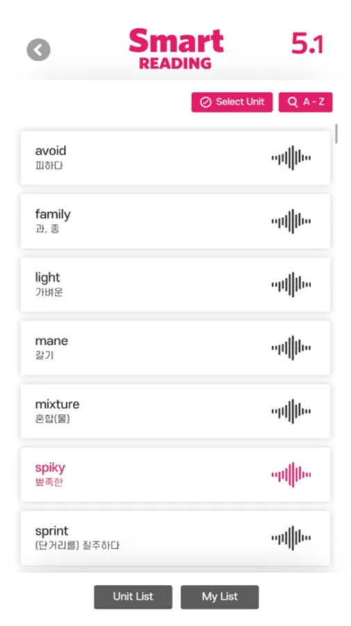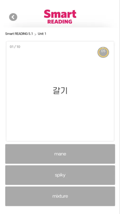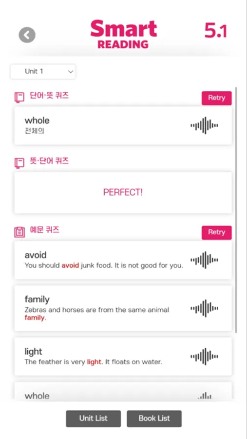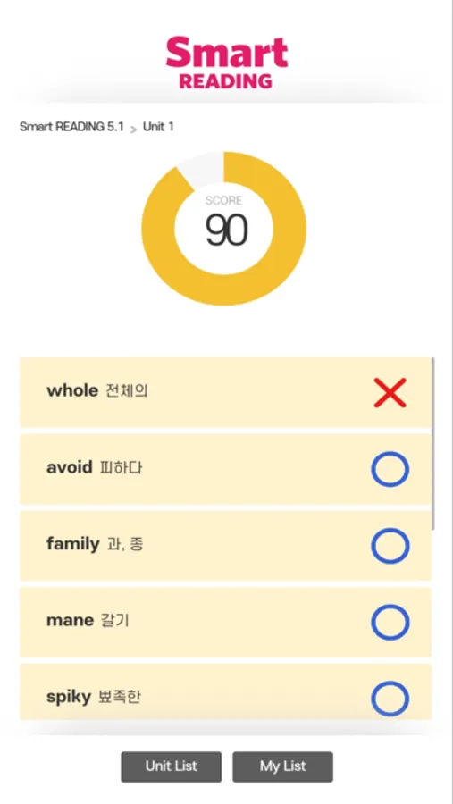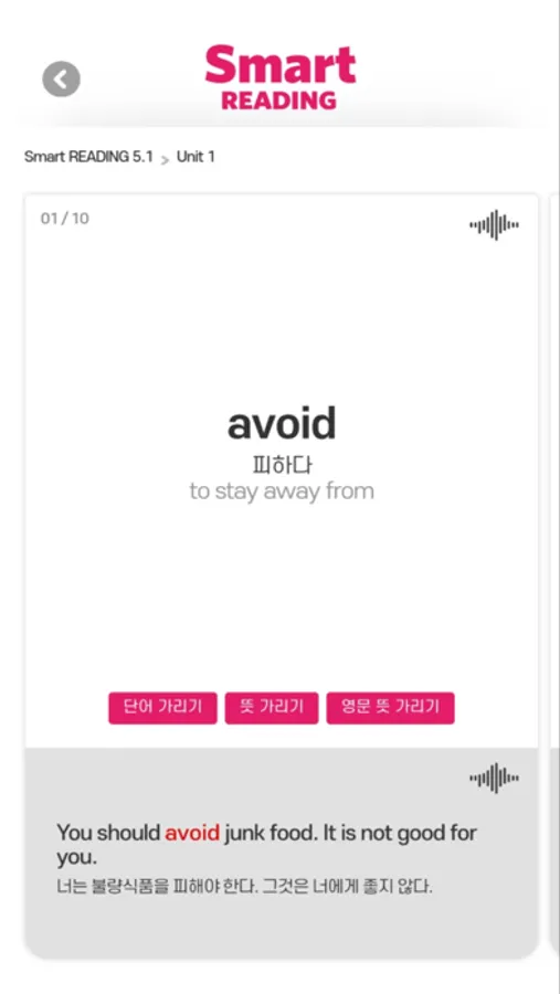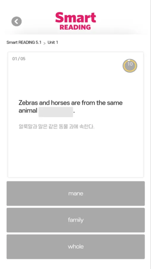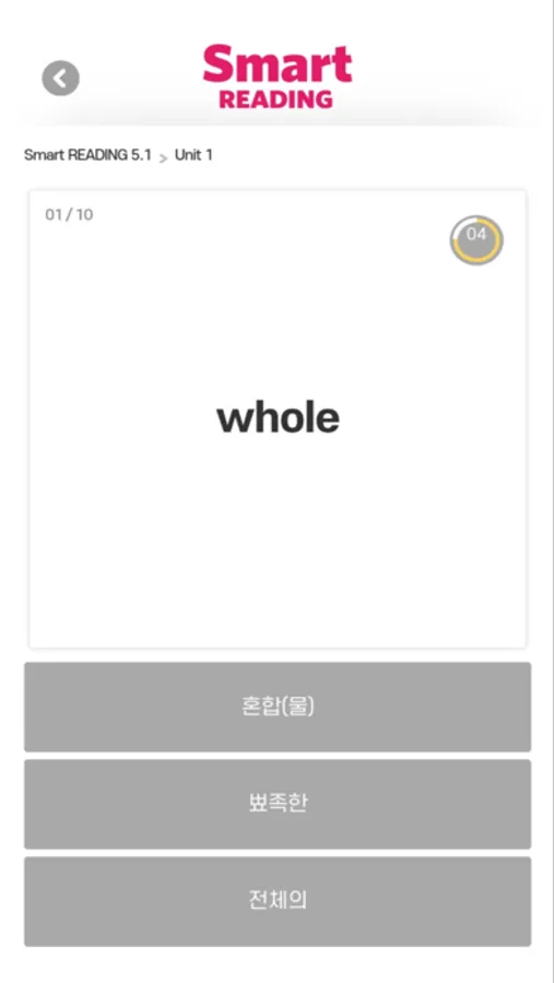 Smart Reading Word App은 Smart Reading 교재의 단어와 문장을 다양한 형태의 퀴즈로 복습할 수 있는 Word App입니다. 고학년 학습자의 레벨에 맞게 영문 뜻을 추가하여 학습 난이도를 한 단계 상승시켰으며, 학습자는 오답 노트 기능을 통해 틀린 단어를 반복해서 학습함으로써 완벽하게 익힐 수 있습니다.