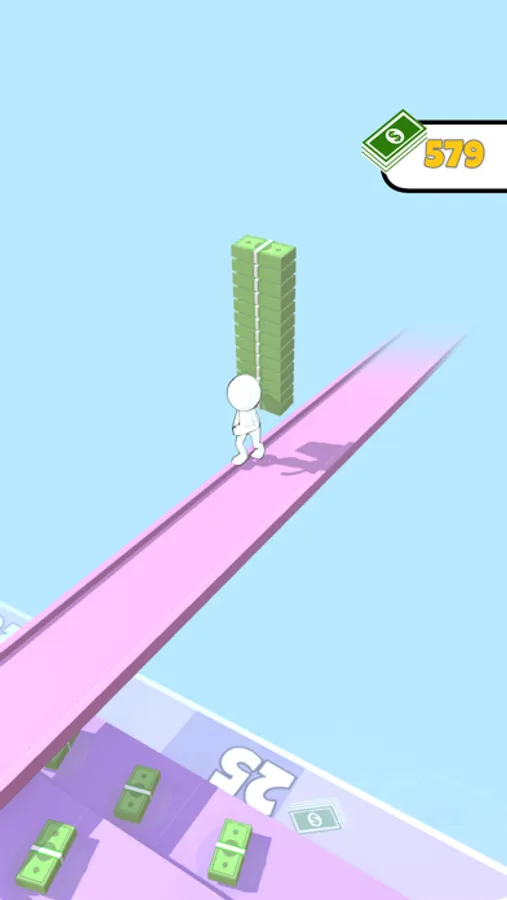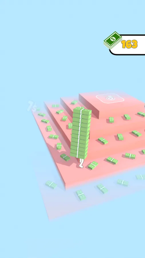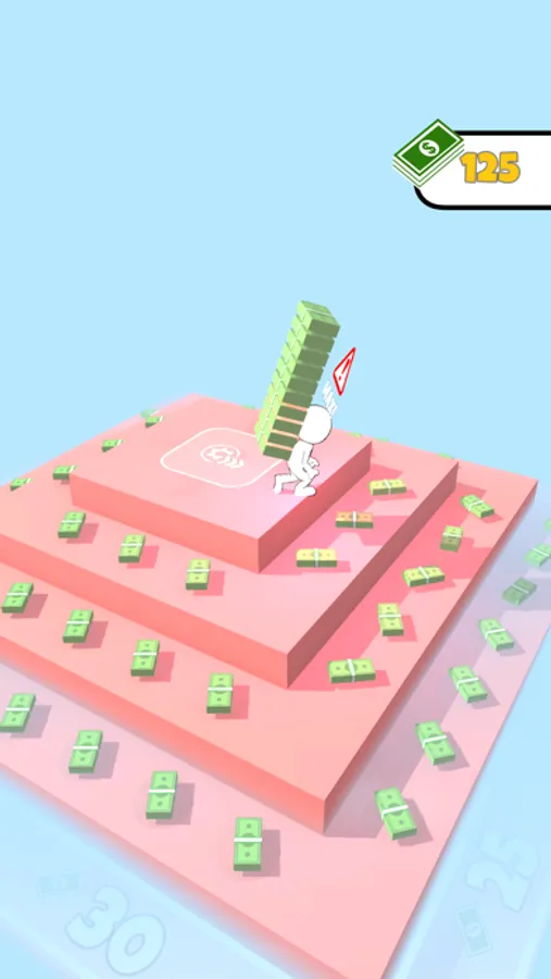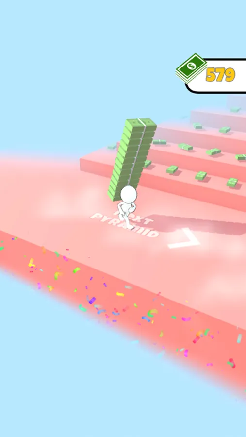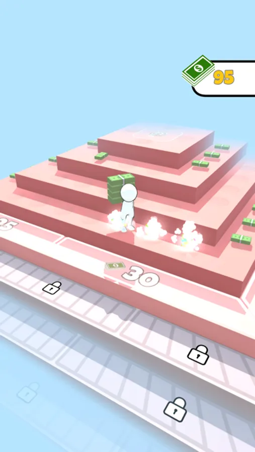 Walk around the sides of pyramid, collect moneys and unlock new stairs down below of the pyramid. Collect more money to reach new pyramids on the game.
