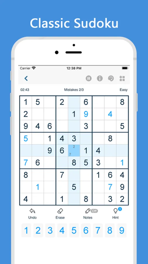 The rules of the Classic Sudoku puzzle game are very simple. The goal is to put 1 to 9 numbers into each grid cell so that each number can only appear once in each row, column, and block. Even a beginner can master the sudoku free puzzle game in a very short time.