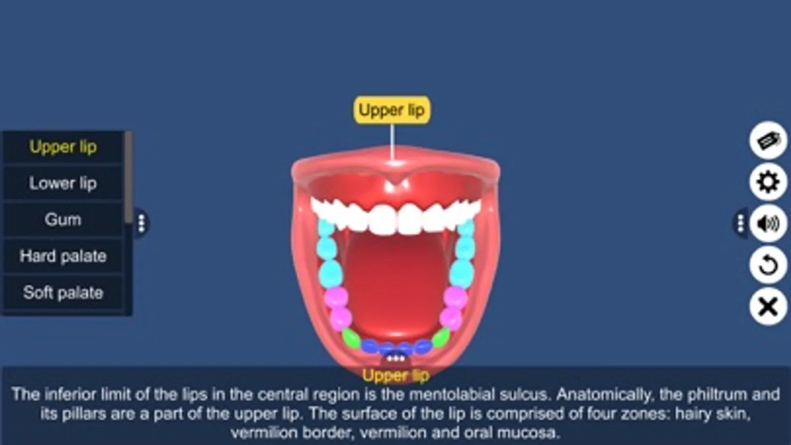 This app has one 3D models related to parts of a buccal cavity. You can see the information of each model by tapping on the window labels, which helps the user to learn about parts of a buccal cavity. This app can be useful for students and teachers about parts of a buccal cavity study. You will be able to see this model better in 3D angel by zoom in, zoom out and rotate, so that you can learn better about its part. As well as those who want to do a study related to parts of a buccal cavity, this app can be useful.