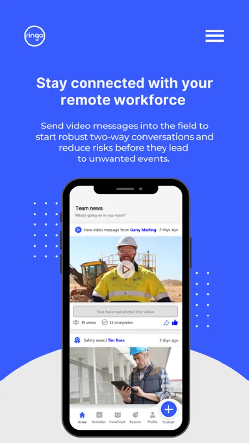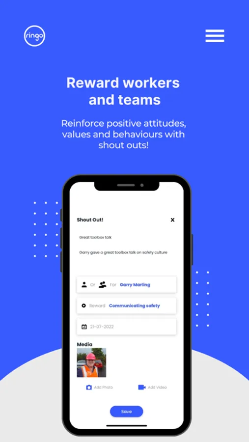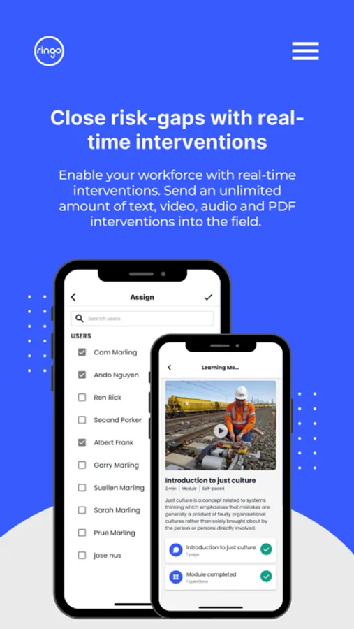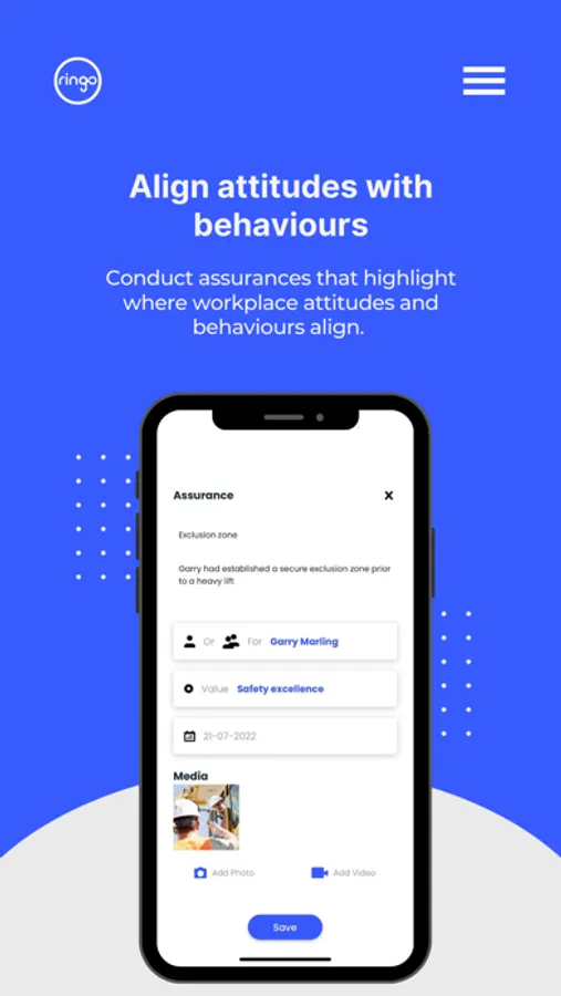 Ringo blends prominent people science theory with real-time video communication, behavioural measurement tools, expert micro-training modules and a rewards program to identify risks before they lead to unwanted events.