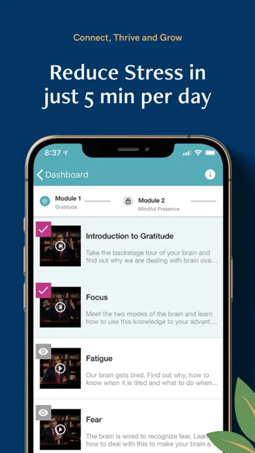 • Short expert, self-paced educational videos on gratitude, mindful presence, resilient mind, and