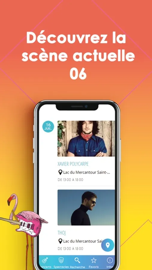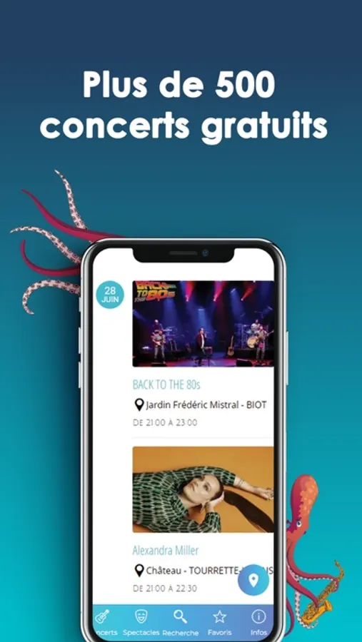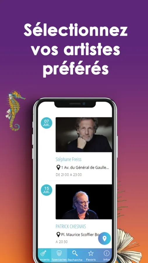 Concerts, spectacles, théâtre, jazz, magie, littérature… l’application vous informe en temps réel des dates et des lieux de production de vos artistes préférés ! Ainsi, vous pouvez personnaliser votre agenda culturel en ajoutant des artistes à vos favoris, en les classant selon vos goûts, en recherchant les événements par dates ou par communes, en consultant l’itinéraire pour vous rendre à l’événement qui vous fait envie ou encore en géolocalisant chaque lieu depuis chez vous !