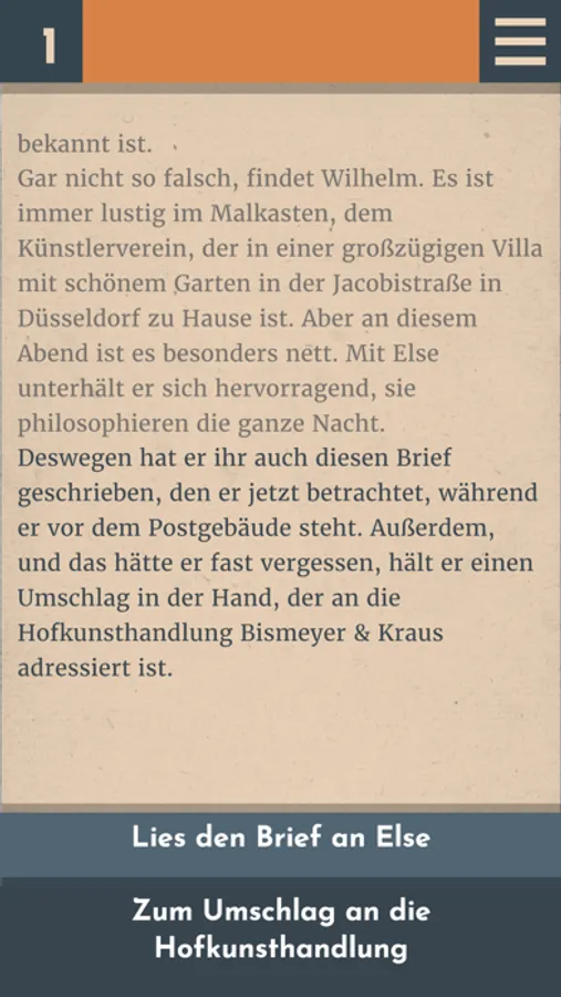 Als Spieler werdet ihr jetzt zum Akteur. Eure Entscheidungen bestimmen den Verlauf der Erzählung. Die renommierte Autorin Theresia Enzensberger hat, basierend auf wahren Begebenheiten aus Lehmbrucks Biografie, eine fesselnde Geschichte geschrieben. Ihr taucht ein in seine Zeit und begleitet den Künstler durch Höhen und Tiefen seines bewegten Lebens, lernt Freund:innen und Zeitgenoss:innen kennen und bekommt Einblicke in den Schaffensprozess seiner Werke.