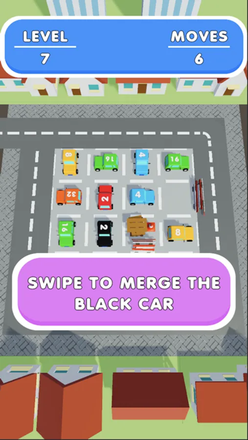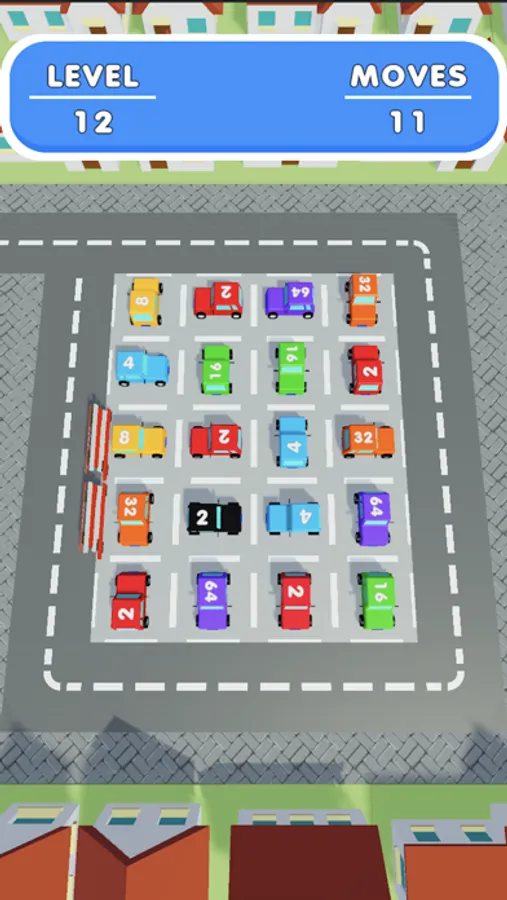 Merge the black car with cars of its own level to make way for it through the crowded parking lot.
