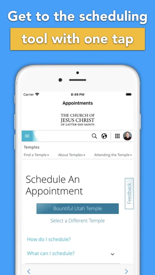We built this app to be the fastest and most reliable way to get the temple appointment scheduling tool. Just tap the app, log in, and you're on your way to scheduling your next appointment at the temple. We also included a few additional features including: