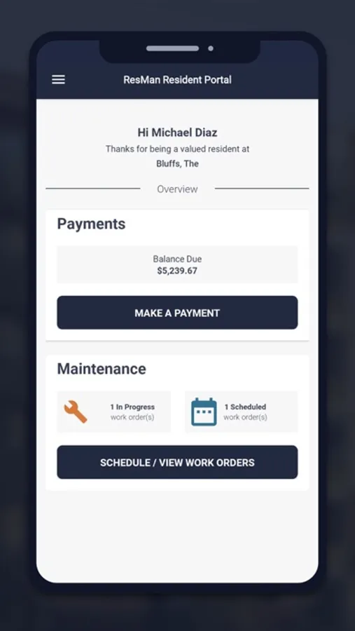 The ResMan Resident App serves as the mobile version of the ResMan Resident Portal for communities that use the ResMan property management platform. Availability of some app features is dependent on the ResMan product features enabled for the community. If you have any questions about specific features, please reach out to your property management company.