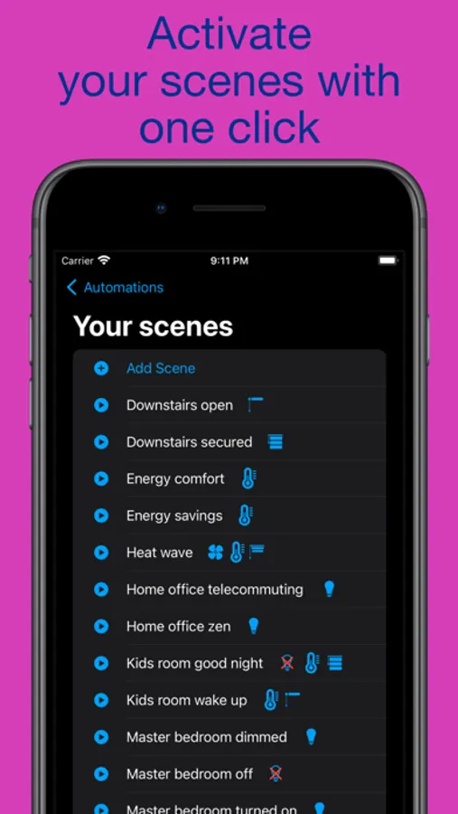 At a glance you see all the scenes you have created to define your favorite ambiances. You trigger the scene of your choice with a simple click and your devices adjust automatically: the bulbs have the right intensity, your shutters open or close... You take full advantage of the promises of the smart home with Matter or Apple HomeKit.