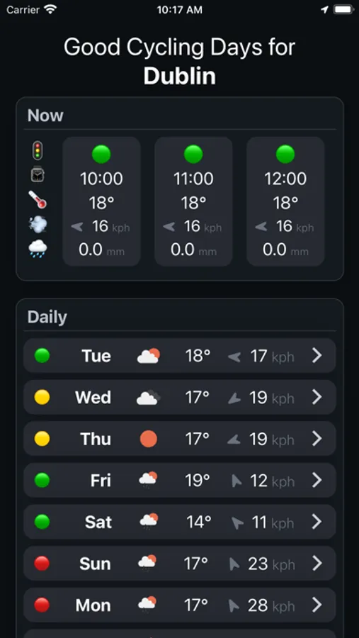 In the app, you get clear traffic light indicators as to which days are good for cycling. You can see how the current wind affects your common routes to help you decide which one to pick.
