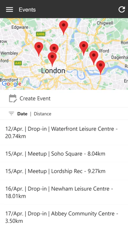 Find and create events at any Table Tennis location: club, coach, leisure centre, community centre, university, further education college, shopping mall, workplace, bar, venue, park and public tables. Event information and reminders appear automatically in the local city chat group and players can see a calendar of events for 100 kms in the app.