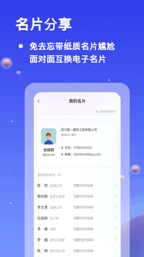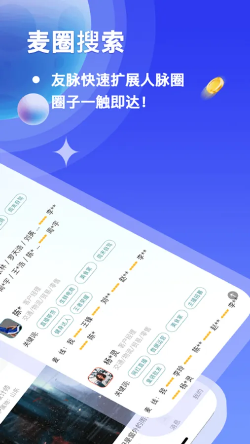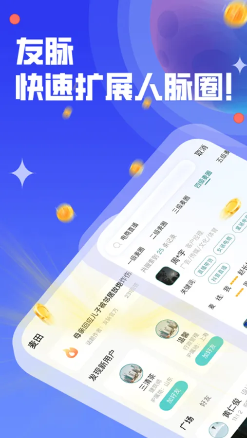 友脉以直接好友为1级,呈现2-6级人脉关系,迅速建立人脉;