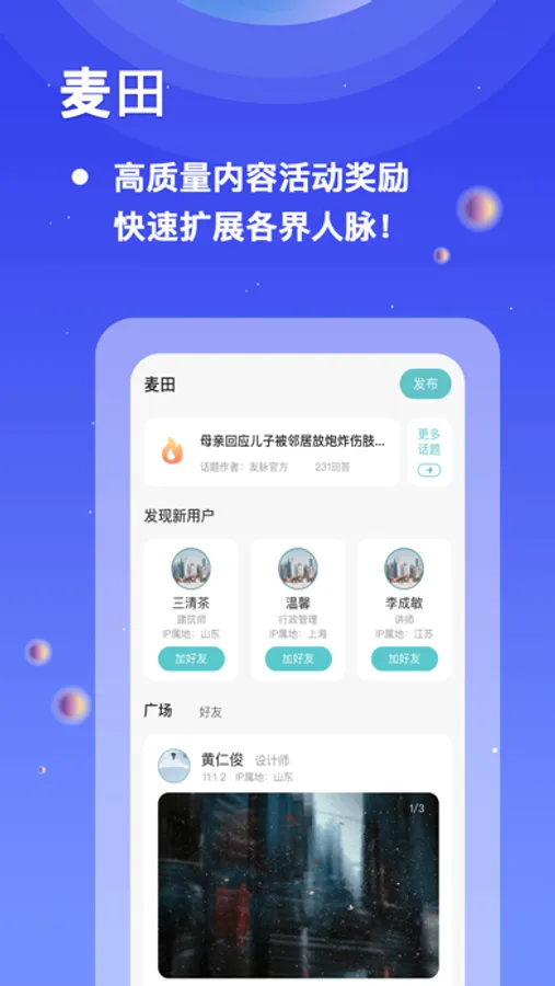 3、来友脉广场向你的圈子展示自我,结交新朋友。