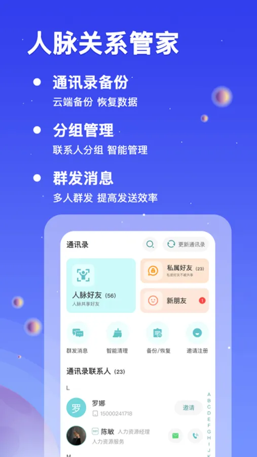 2、备份管理:手机通讯录一键备份至网络,随时同步回手机;