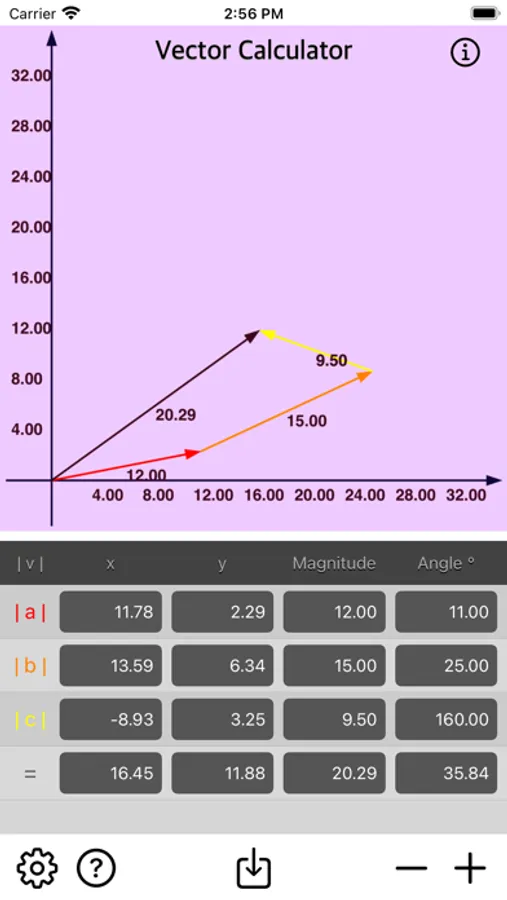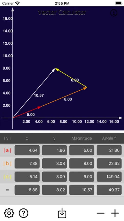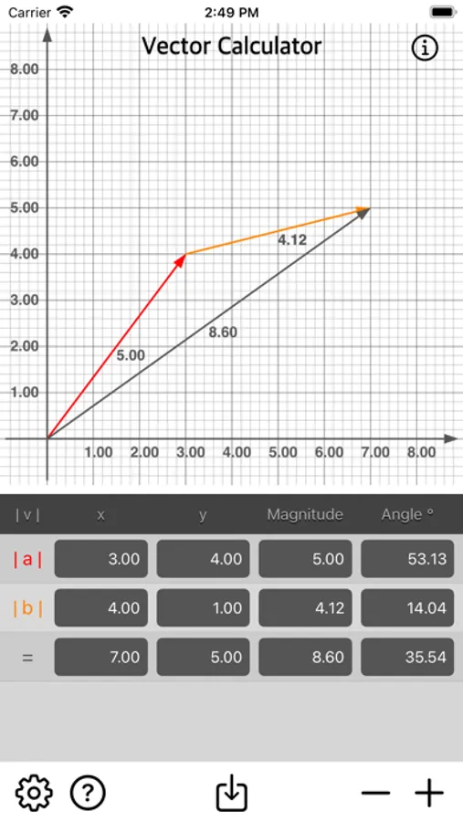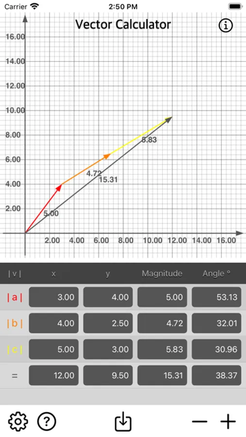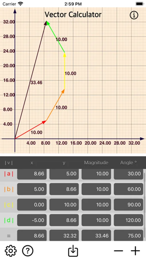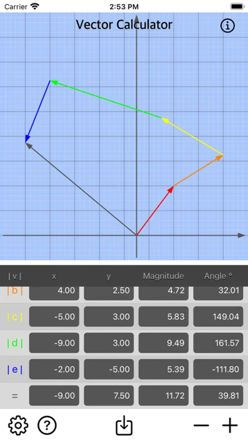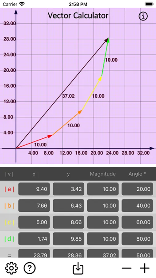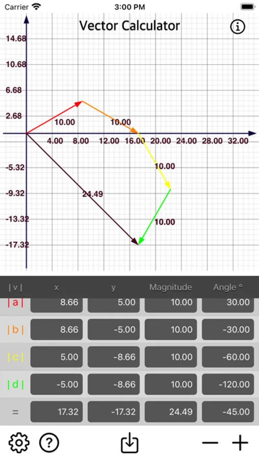 • Add multiple vector by x, y, magnitude or angle.