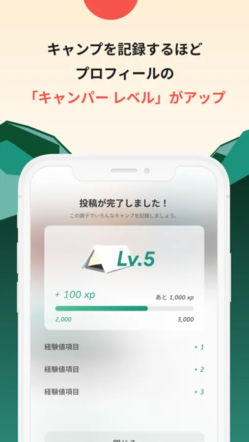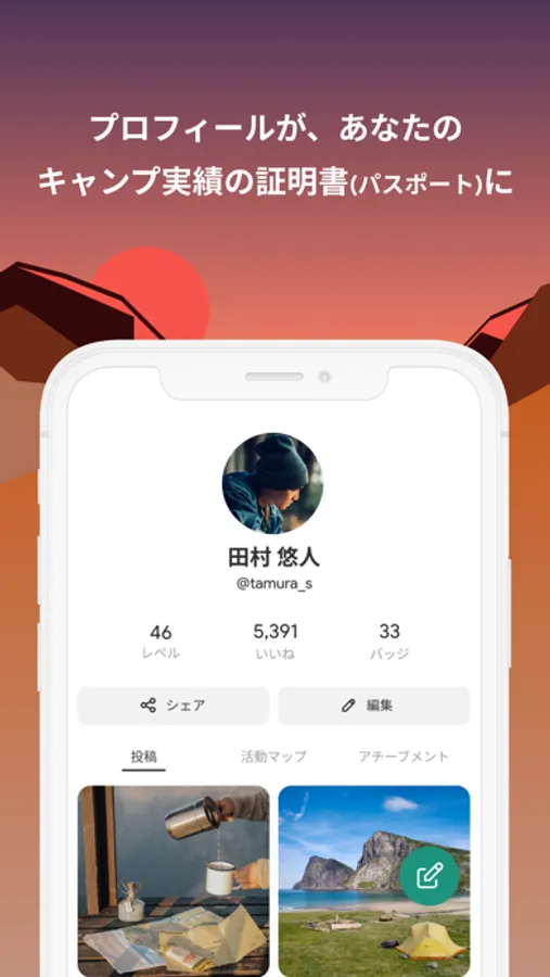キャンプの記録に応じて「経験値」が付与され、あなたのプロフィールであり、キャンパーとしての実績の証である「パスポート」に反映されます。