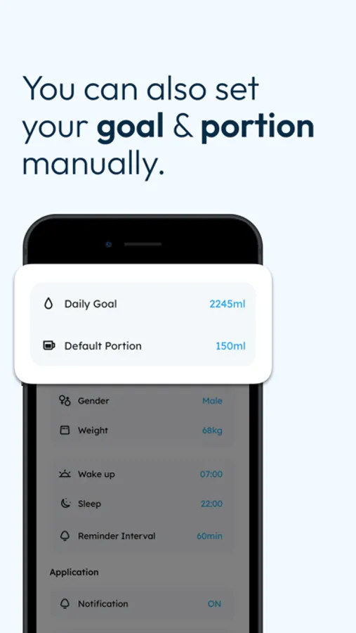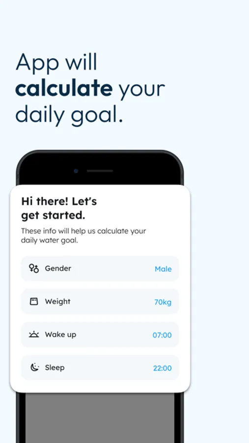 You can set your water tracker app in less than a minute just by adding your age, gender, and weight.