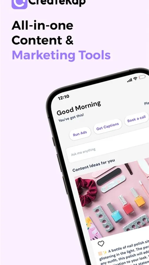 CreateKap all-in-one AI powered business growth and content app: social media content, SEO and search. Get personalized social media content with your brand voice delivered daily by simply uploading an image. Run Ads that converts to sales and get answers to your questions.