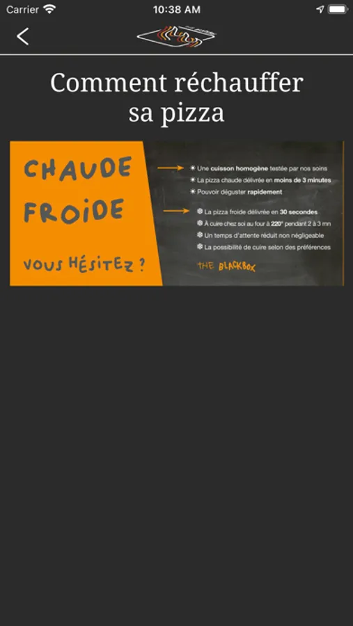 Choisissez votre pizza préférée, payez sur l'application, rendez vous devant le distributeur de pizza THE BLACK BOX le plus proche et dégustez !