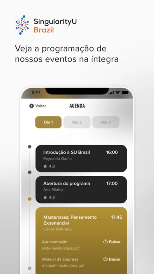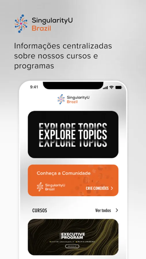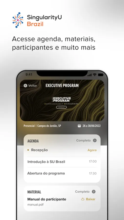 E agora de uma forma ainda mais fácil e acessível: através do APP SU, onde é possível ter acesso a informações a respeito dos programas e cursos da SingularityU Brazil que você está inscrito. Confira a agenda de palestras, workshops e experiências práticas; obtenha os materiais disponibilizados pelos facilitadores dos momentos; conecte-se com os demais participantes e faça parte do nosso ecossistema.