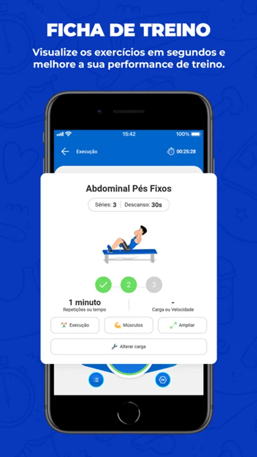 - Ficha de treino interativa com animações, definição de carga, cronômetro e tempo de execução;