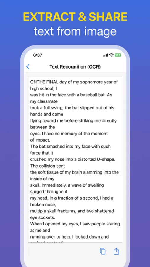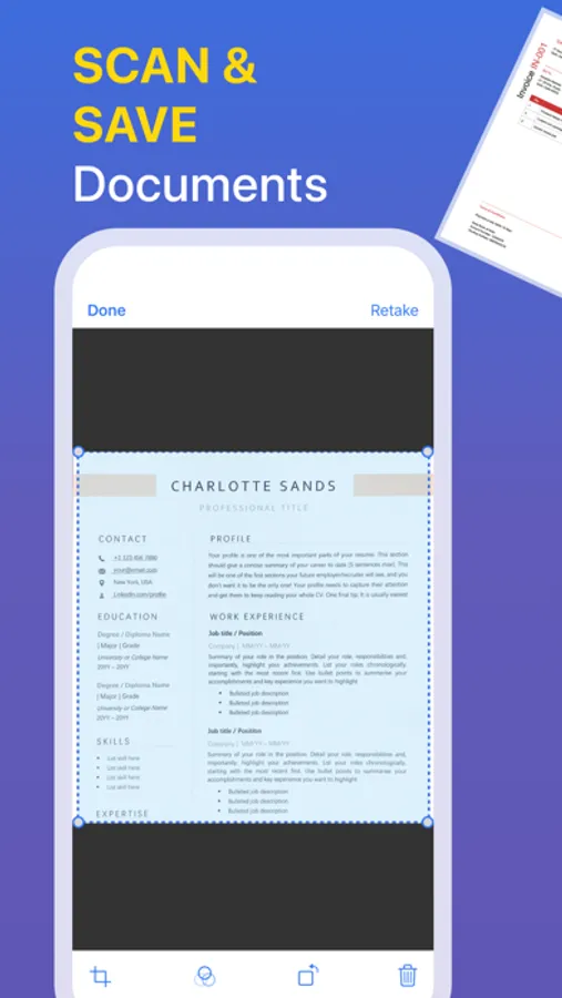 • Scan anything - receipts, pictures, notes, business cards, contracts, fax papers, and books with precision and turn them into PDF, Word, or JPEG files.