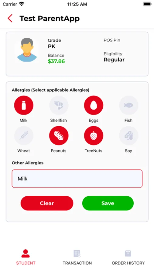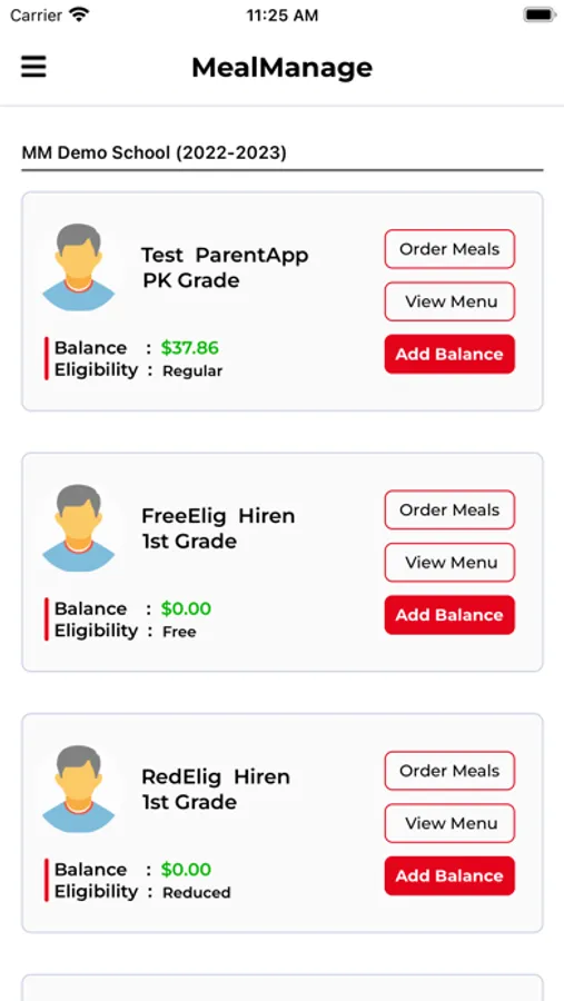 Simplified login to access parent dashboard to view and manage kids profile, view active menus, pre-orders meals, make online payment for meals ordering, fund meal accounts online, secure payments for meal orders. Manage student allergies. View Transaction history and meal orders details.