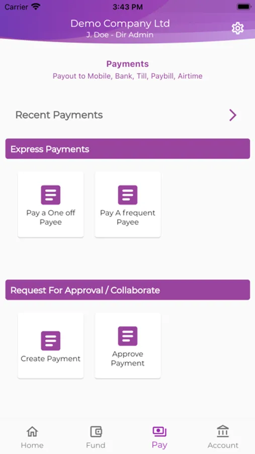 - Company Spend – settle any expense digitally, to mobile number, till, paybill or bank. e.g suppliers, utilities and taxes.