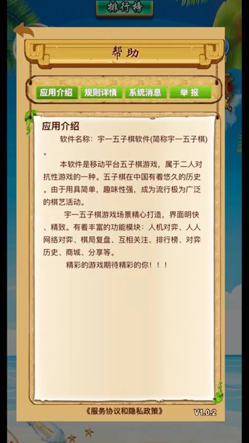 软件名称:宇一五子棋软件(简称宇一五子棋)。 本软件是移动平台五子棋游戏,属于二人对抗性游戏的一种。五子棋在中国有着悠久的历史。由于用具简单,趣味性强,成为流行极为广泛的棋艺活动。 宇一五子棋游戏场景精心打造,界面明快、精致。有着丰富的功能模块:人机对弈、人人网络对弈、棋局复盘、互相关注、排行榜、对弈历史、商城等。 精彩的游戏期待精彩的你!!!