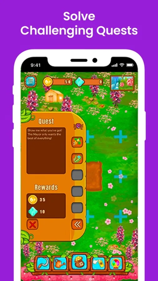 → Complete quests to earn coins; try to get rich in both coins and gems