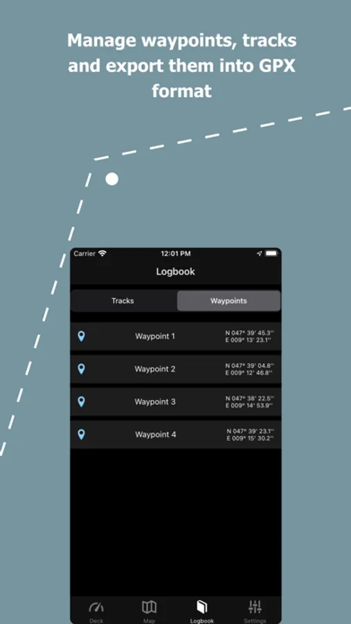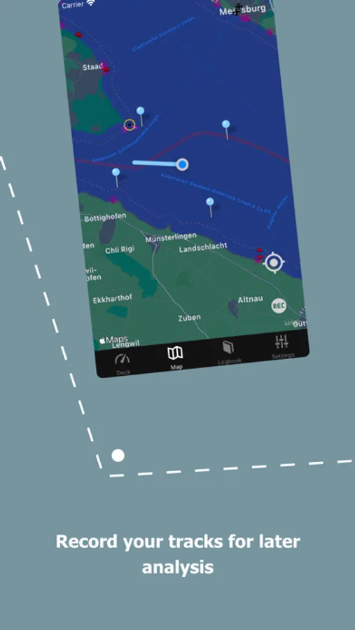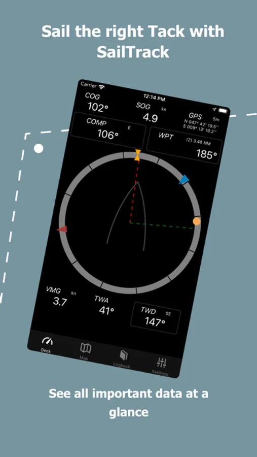 With SailTrack you keep track of all important information about your course and your sailing performance. On a simple screen you can see your speed, the course over ground and your angle to the wind. Sail into the wind, mark the true wind direction and use the laylines to see if a tack will lead you to your next waypoint.