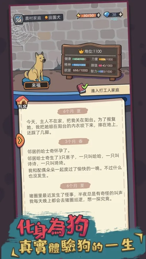 你將隨機出生在某個城市的某個家庭裏,經歷從0歲開始慢慢長大,體驗一只狗的一生。