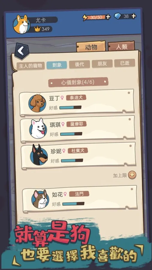 基因育種:一開始你是只土狗,你羨慕那些出生在皇室家庭的寵物狗。為了體驗到他們的生活,你需要研究強大的基因育種系統,想一想如何才能從土狗誕生出超級強大的柯基呢?
