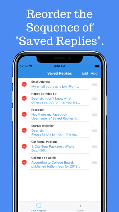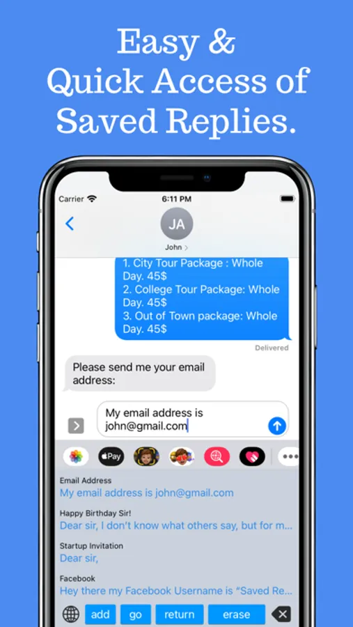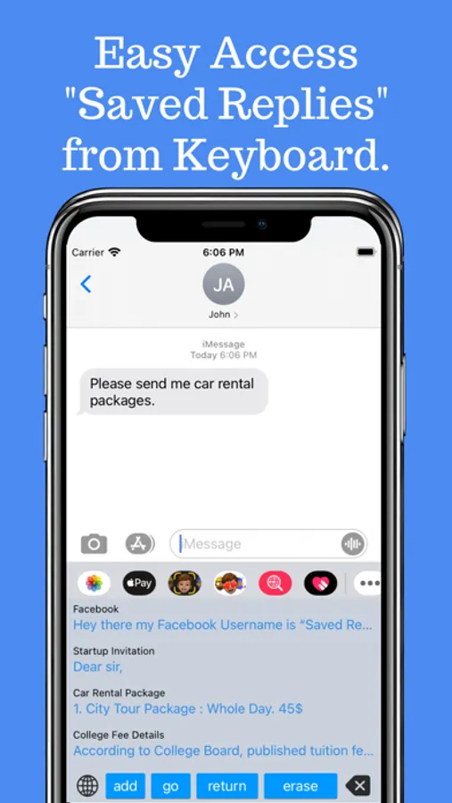 Users saved replies are accessible all over iPhone by using "Saved Replies Keyboard".