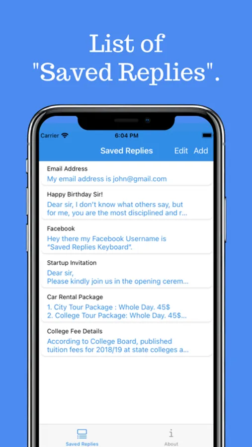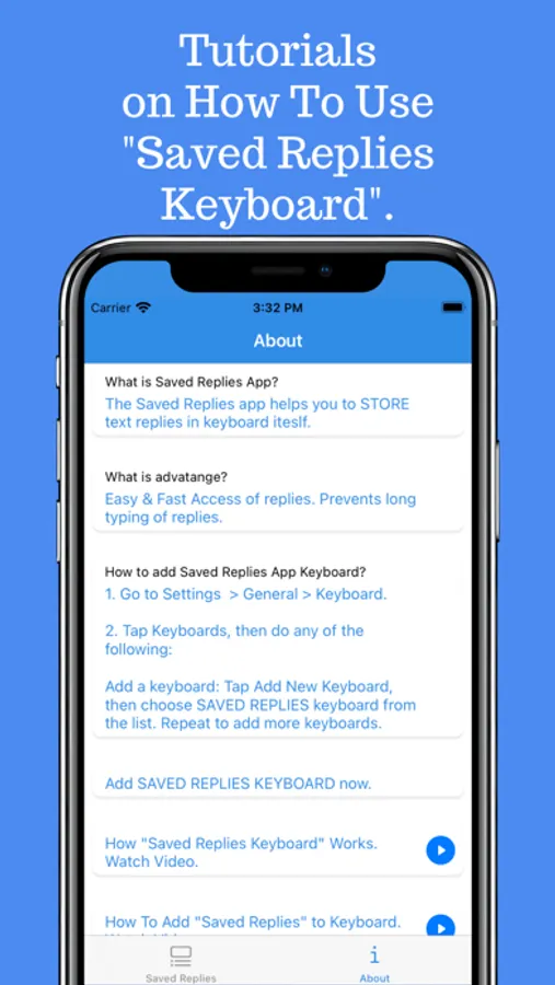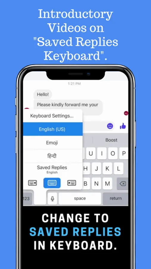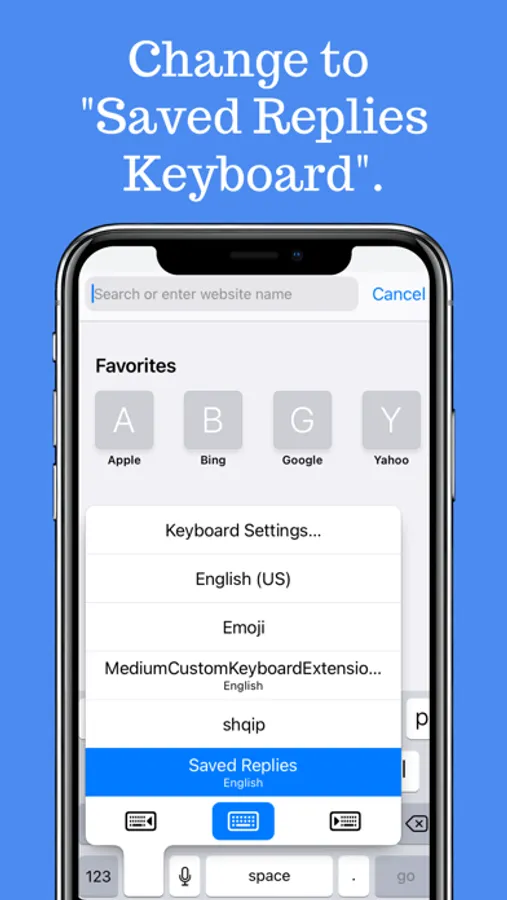 "Saved Replies Keyboard", is iOS keyboard extension app. This app allows users to add custom keyboard in their system.