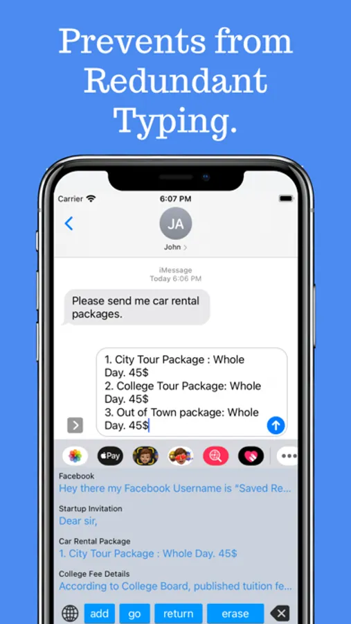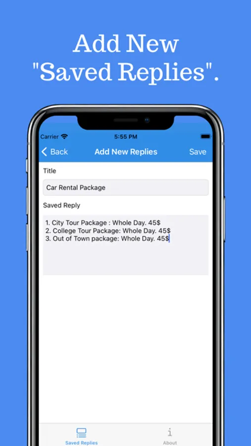 The app allows user to save replies and text which they use repeatedly. Instead of typing time and again and for multiple times, now user can select those replies directly from the "Saved Replies Keyboard".