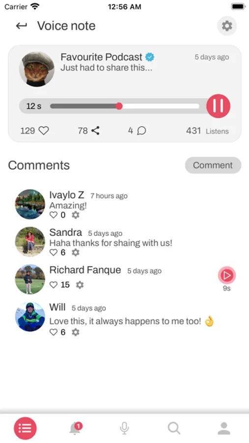 > Like, share and comment on friends’, family’s and influential voices’ voice notes.