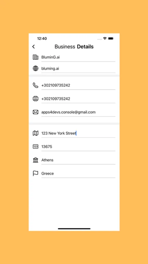 1. Business Details: Add business name, Address, phone, email, and additional notes.