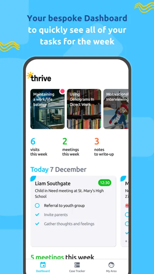 Built by social workers for children’s social workers in the UK, thrive leverages the following four key features aimed at empowering social workers to do their best work while protecting them from burnout by allowing them to see symptoms early before it is too late: