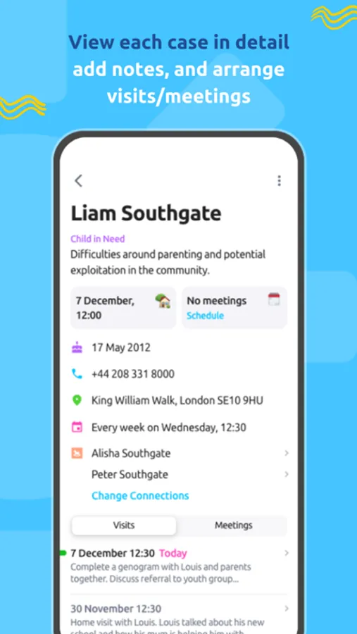 All your visits, meetings and assessments in one place with timescales that update automatically. Never worry about making a new things to do list again.