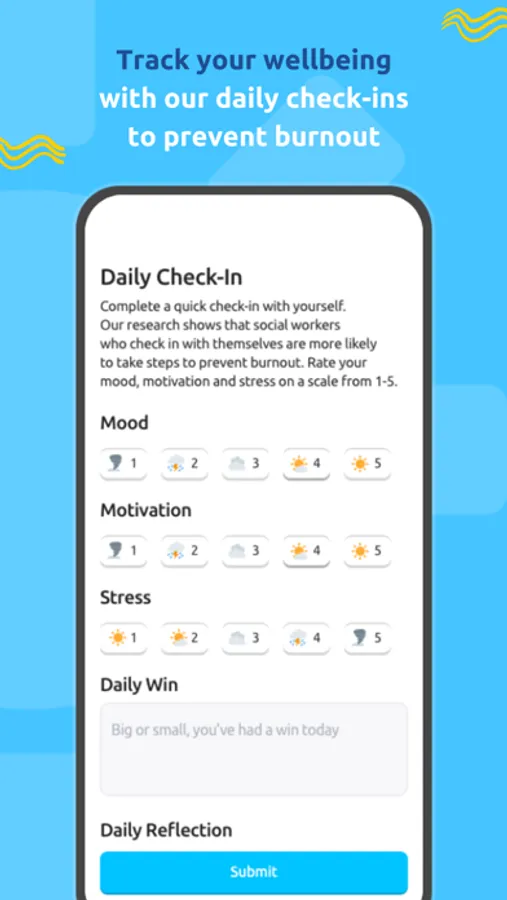Daily check-ins to remind you to look after your own needs. Track your stress, mood, motivation and more. Catch signs of burnout early so you can get support as soon as possible.
