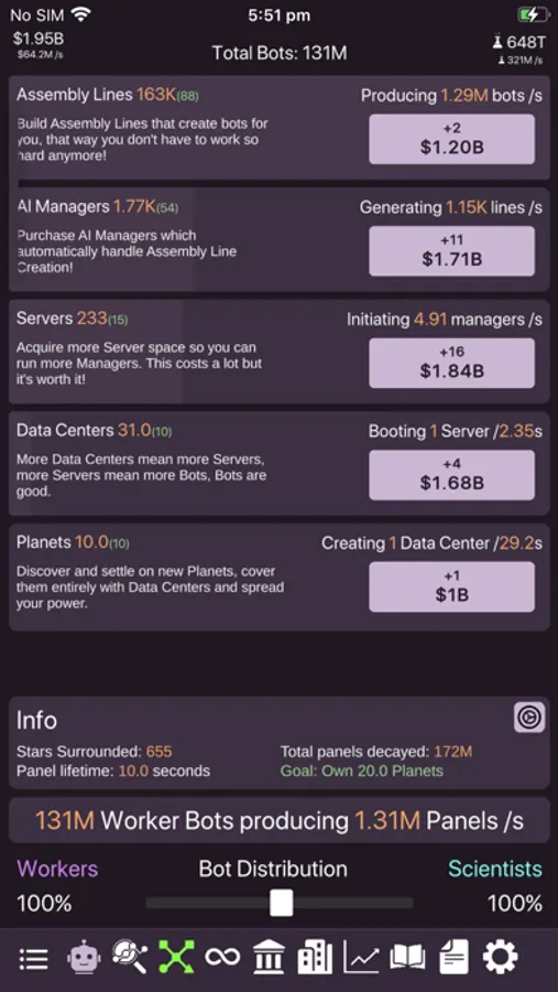 Manage a solar empire, produce bots which will make solar panels for you. Send your panels to the sun to generate energy and sell that energy to make money which you can spend on even more bots!