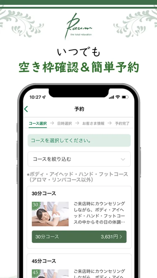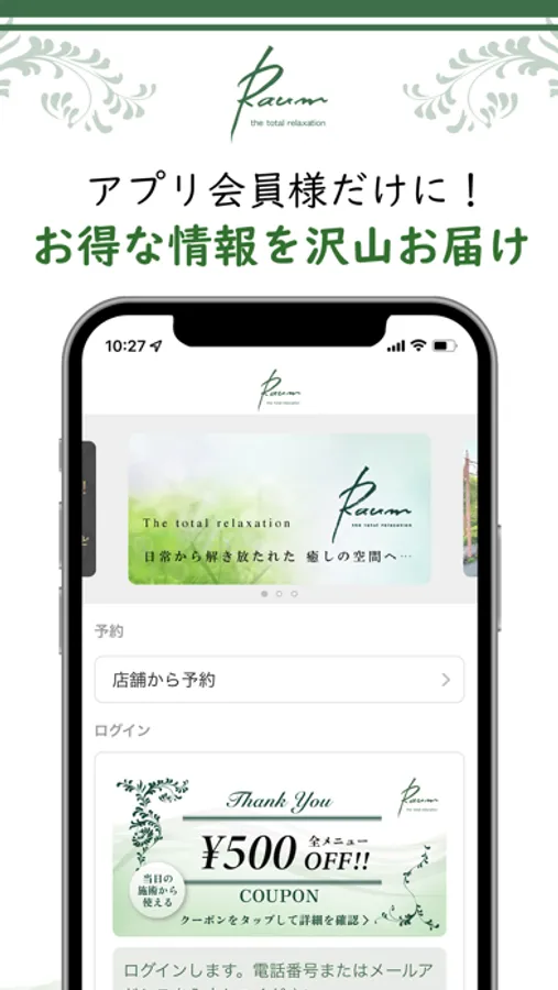 アプリをインストールしていただくことによりトータルリラクゼーション ラウムを、より便利に身近にご利用していただけます。