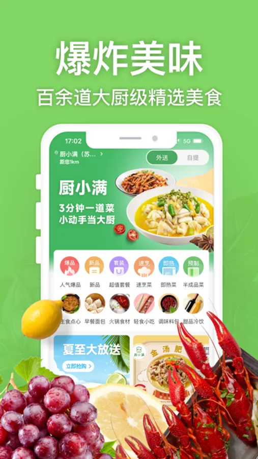 厨小满公司推出速烹菜、即热菜、预制食材,免洗、免切、免调味,通过简单烹制,3分钟即可做出一道美食。秉承着“好吃、新鲜、干净、省时”的核心理念,通过原产地采购第一手新鲜原材料,利用现代标准化中央厨房集中生产,经过卫生、科学包装,通过先进科技加工成成品或半成品菜肴,采用急速冷冻技术储存,以及时保障菜品的新鲜度和原味,通过冷链运输至零售终端,让新鲜可口的食材直达消费者的身边。