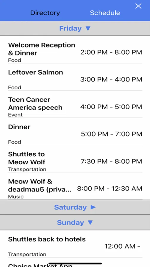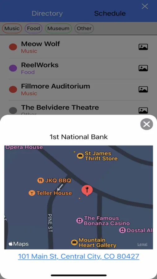 Directory and Schedule companion app for a 4-day event in central city Colorado! From July 29th to August 1st!