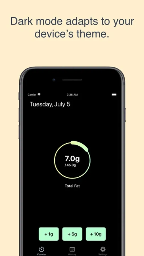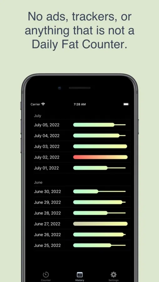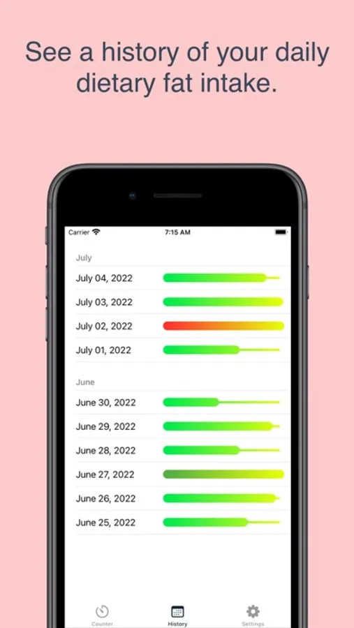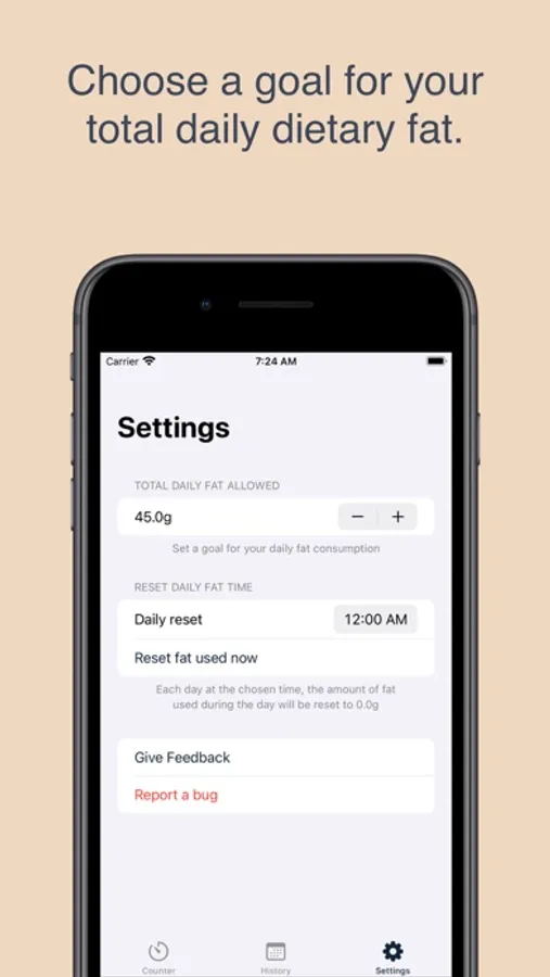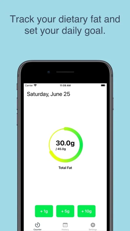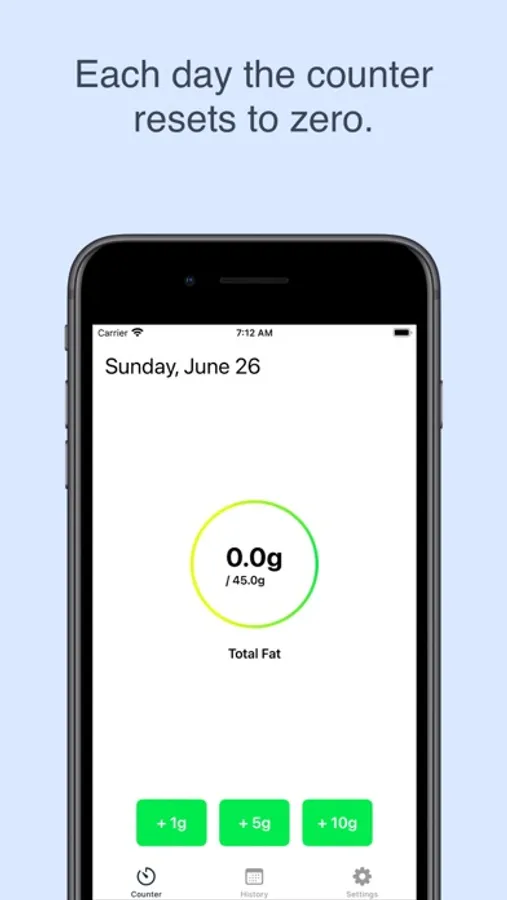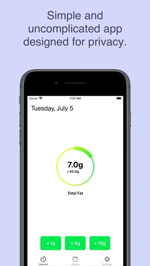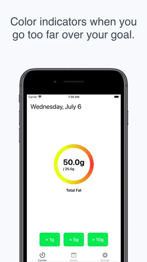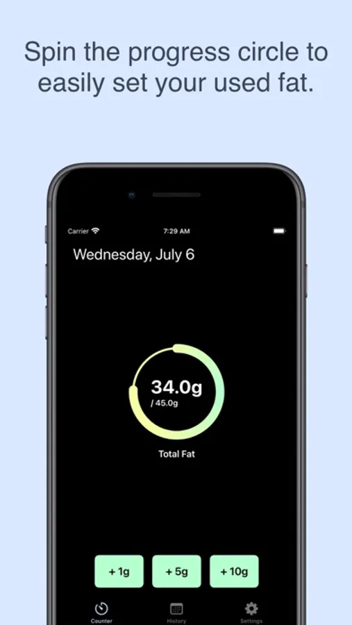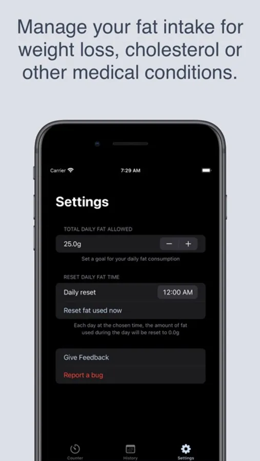 Keep a history of your daily fat intake so you can track the progress of your fat-restricted diet. You no longer have to remember how much dietary fat you have used each day or do math in your head to figure out how much you should eat. Daily Fat Counter is designed to be a simple app that is uncomplicated and easy to use. You can use the nutrition labels on your food to figure out how much dietary fat each meal contains.
