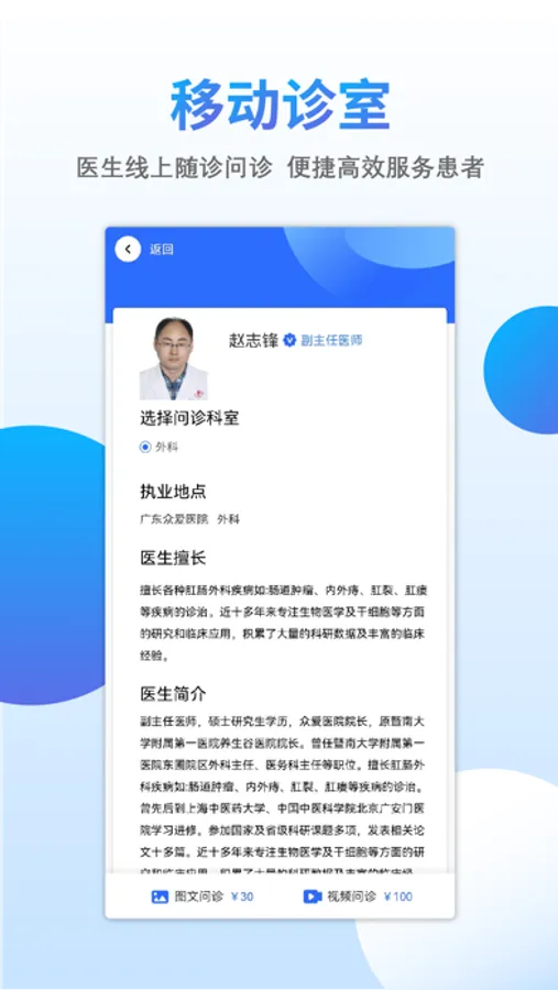 移动诊室:医生突破时间空间限制,可实现各种在线出诊业务,包括问诊、复诊、续方、开检查、开处方等各种服务。