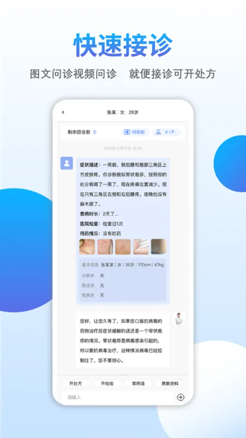 快速接诊:图文问诊、视频问诊等,一键即可接诊,快速响应,提高诊疗效率。