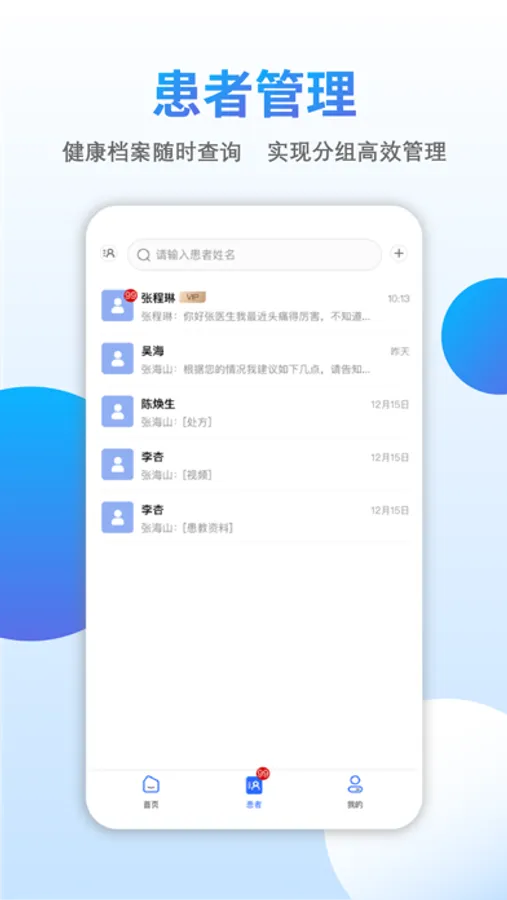 患者管理:可以查看患者信息,设置患者分组、查看患者健康档案、就诊记录、过往病历等。