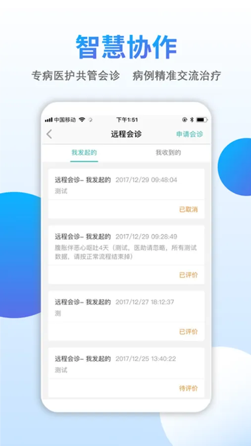 智慧协作:医护健管等多人员可同时在线管理患者、远程会诊、病例讨论、专病组团等服务。