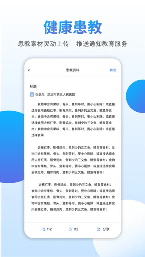 健康患教:通过消息群发,发布公告、专病管理设置等功能,实现精确的患者通知与教育服务。